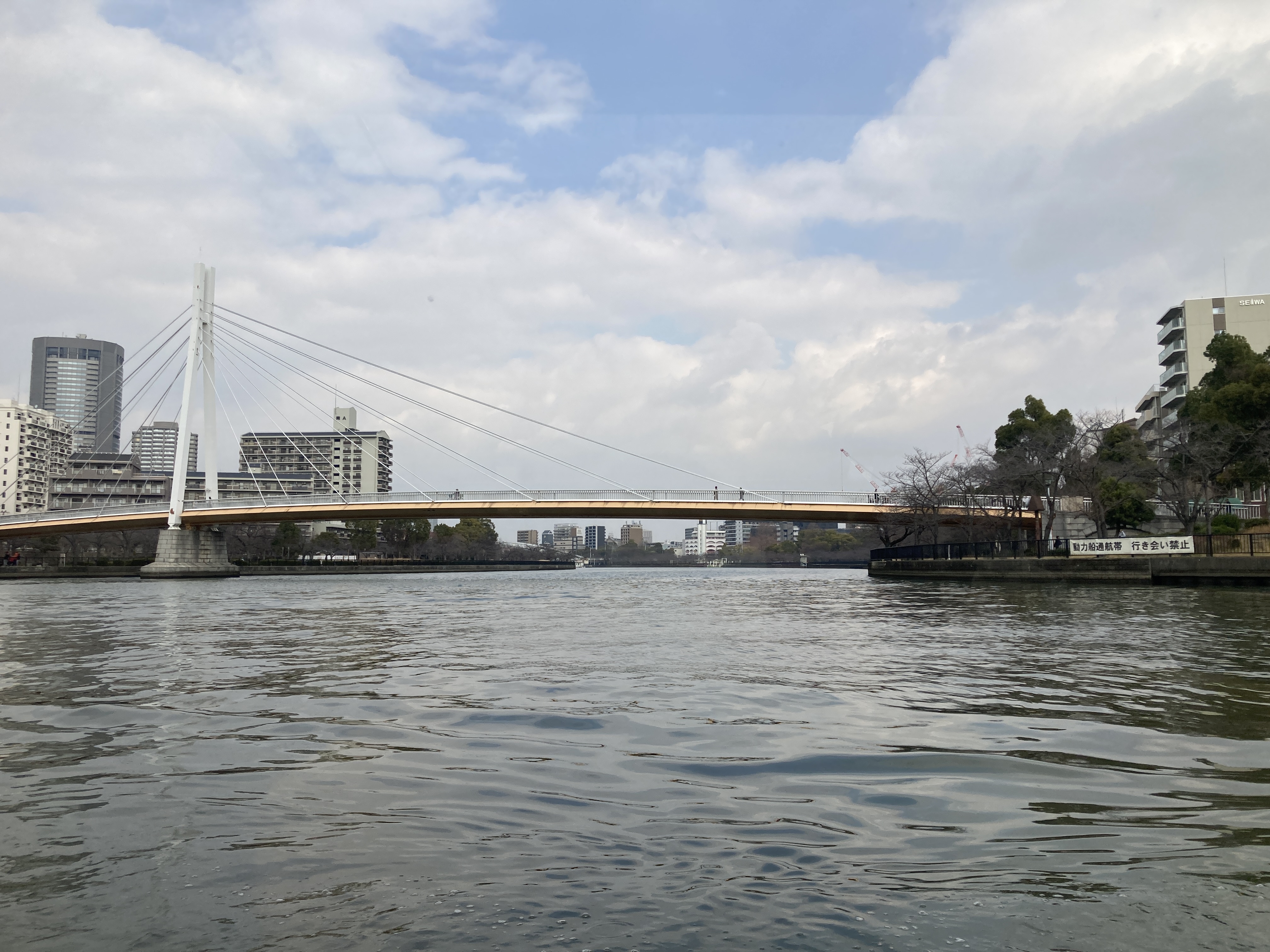 大阪城港は大阪城天守閣から一番近い港です。 遊覧スタート! 大阪市内を流れる、大川(旧淀川)の水面を滑るように走るアクアライナー。 船内からは、いくつもくぐる橋や、四季折々の風景をお楽しみください。 ~アクアライナーからの景色~ ①水上バスのりば 大阪城港 ②新鴫野橋 ③天満橋 ④大阪市中央公会堂 ⑤淀屋橋 ⑥難波橋 ⑦中之島バラ園 ⑧天神橋 ⑨八軒家浜船着場(約5分間停泊) ⑩川崎橋 ⑪大阪造幣局 ⑫大阪城のトンネル ⑬水上バスのりば 大阪城港